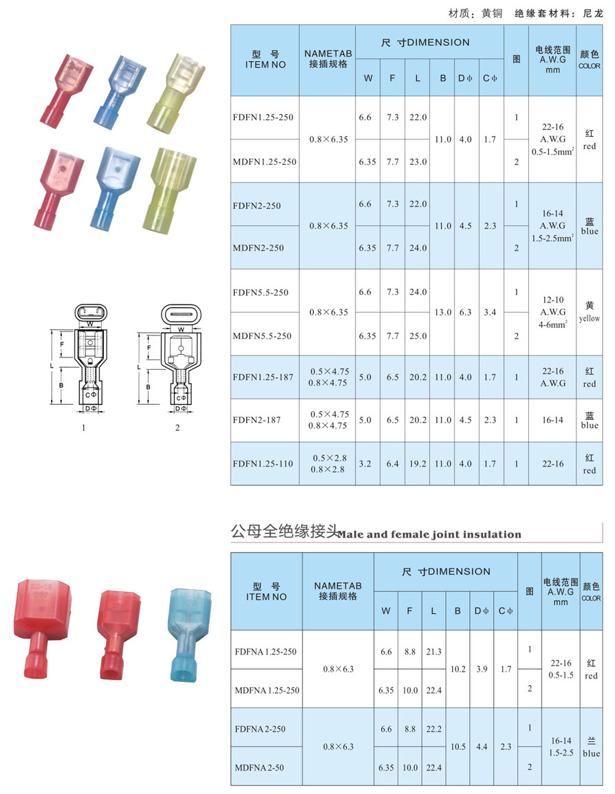 尼龍全包對插端子,6.3插簧 插片,銅端子,冷壓銅端頭 材質:黃銅。 絕緣護套:尼龍絕緣護套。