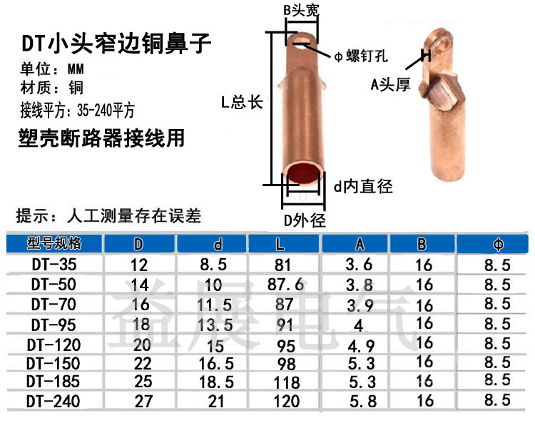 產(chǎn)品特點(diǎn):小頭銅鼻子,小頭銅鋁線鼻子,是專為C45空開 斷路器定制的,能有效的解決普通銅鼻子太寬放不進(jìn)去,用這款DTX小頭銅鼻子或者DTLX小頭銅鋁線鼻子就可以解決這個(gè)問題。具體產(chǎn)品尺寸和特點(diǎn)請(qǐng)于我公司人員聯(lián)系。